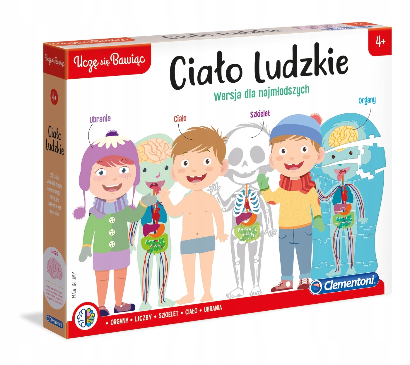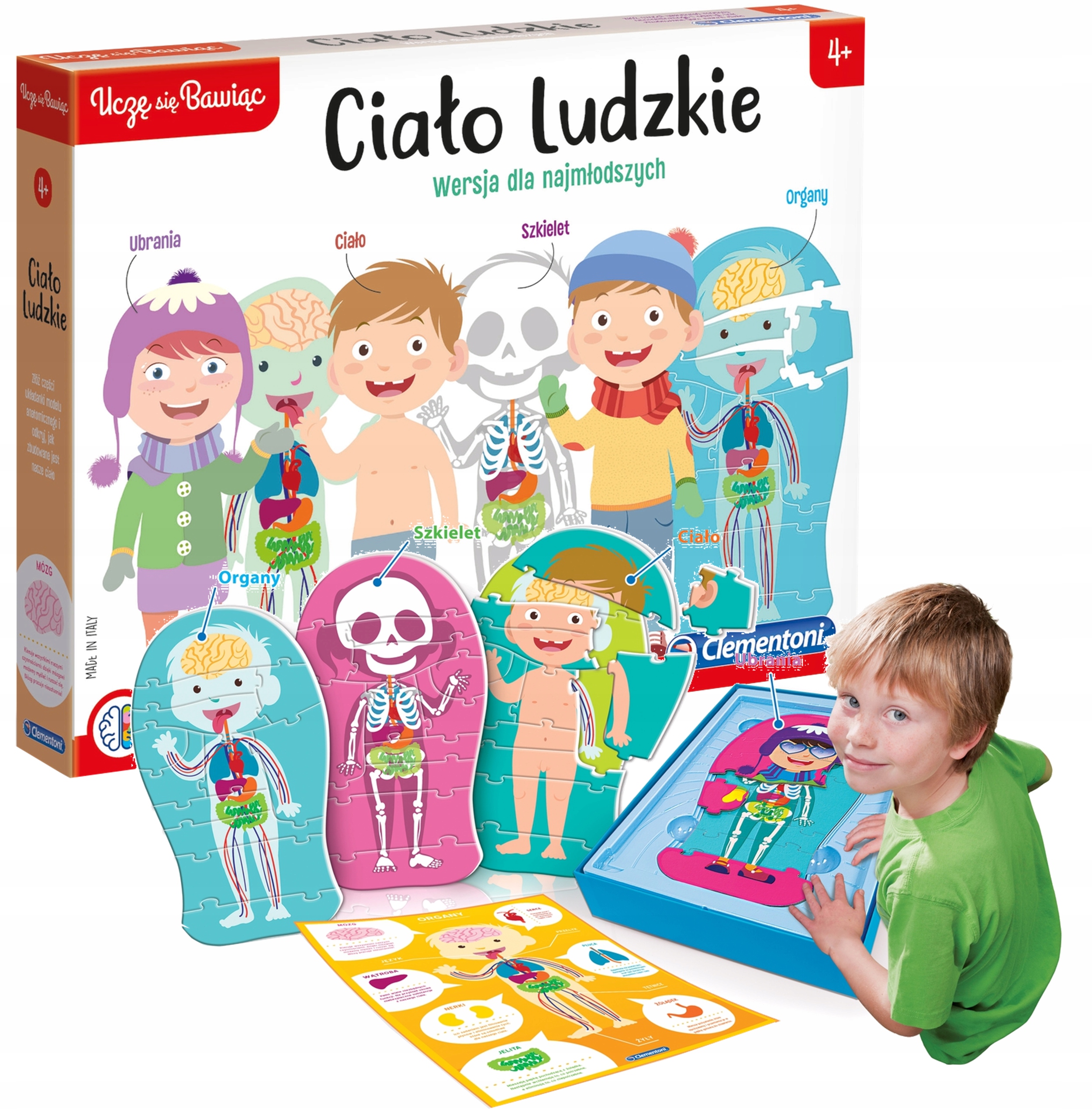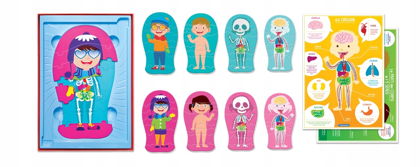 Zestaw od firmy Clementoni – Ciało ludzkie Wersja dla Najmłodszych! Jest to wyjątkowa układanka, dzięki której każde dziecko w łatwy i wciągający sposób pozna pierwsze tajemnice anatomii: zaczynając od szkieletu, po przez organy oraz skórę a kończąc na ubraniu naszego ludzika!