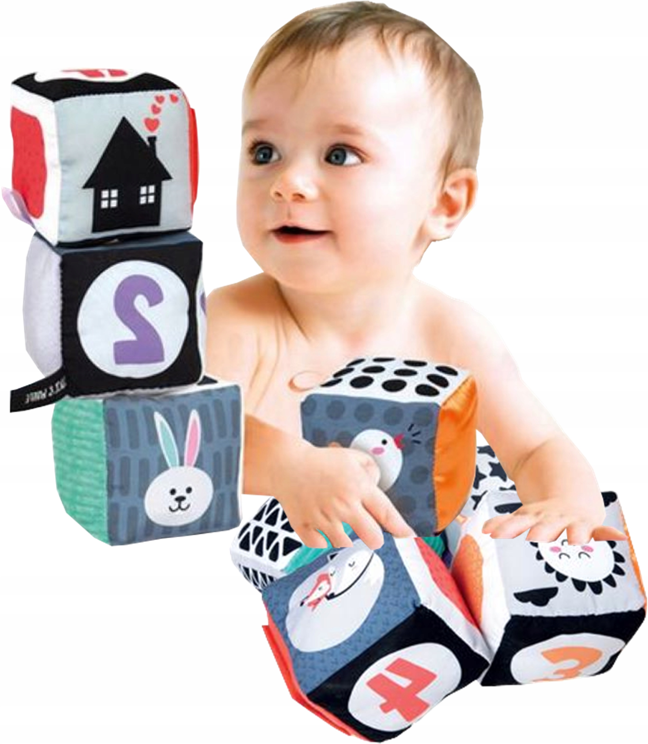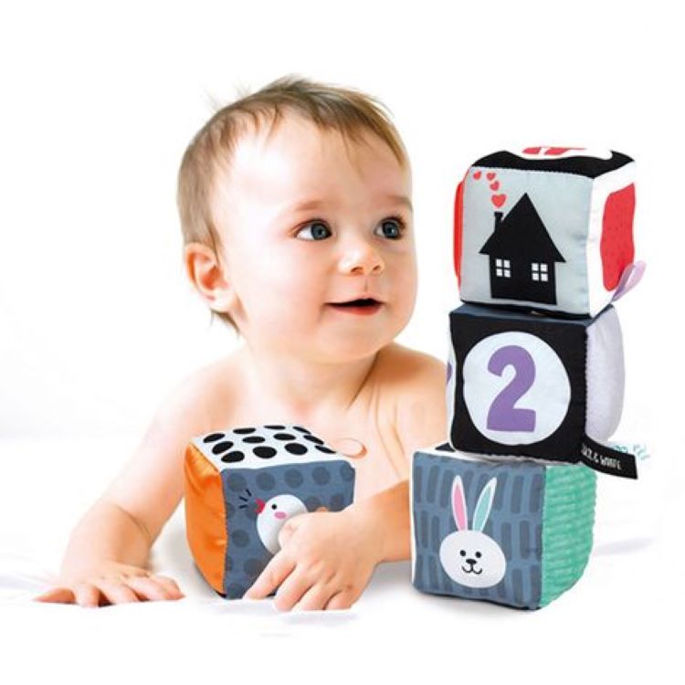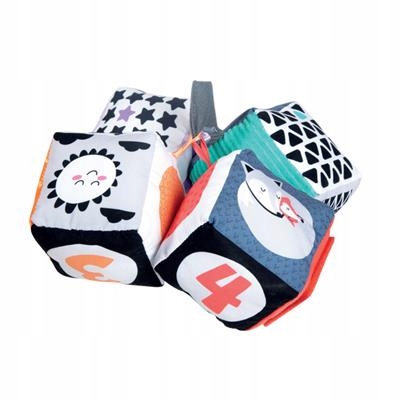 To zestaw 4 miękkich Kostek idealnych do rozwoju percepcji wzrokowej i dotykowej niemowląt podczas pierwszych miesięcy ich życia.