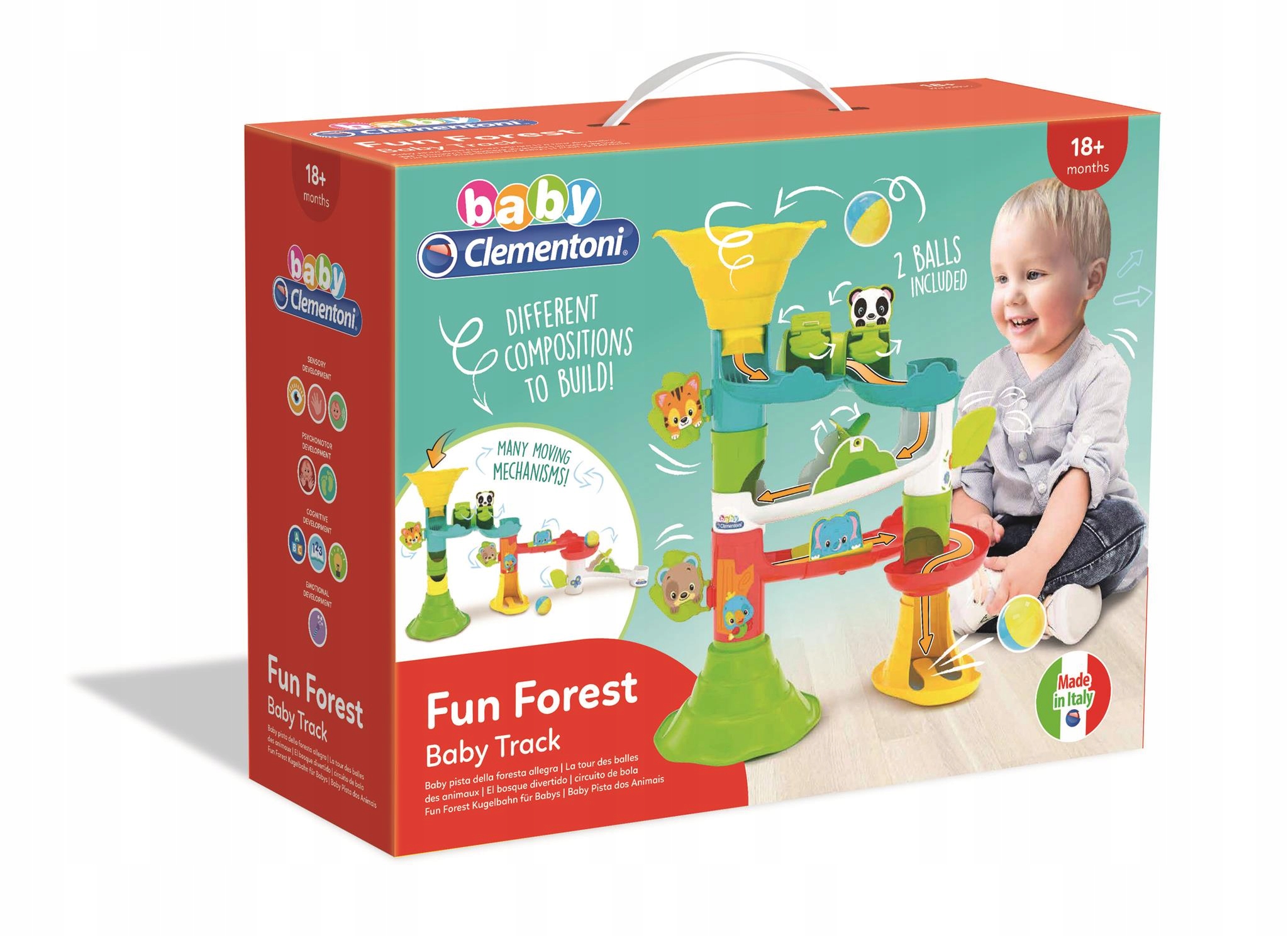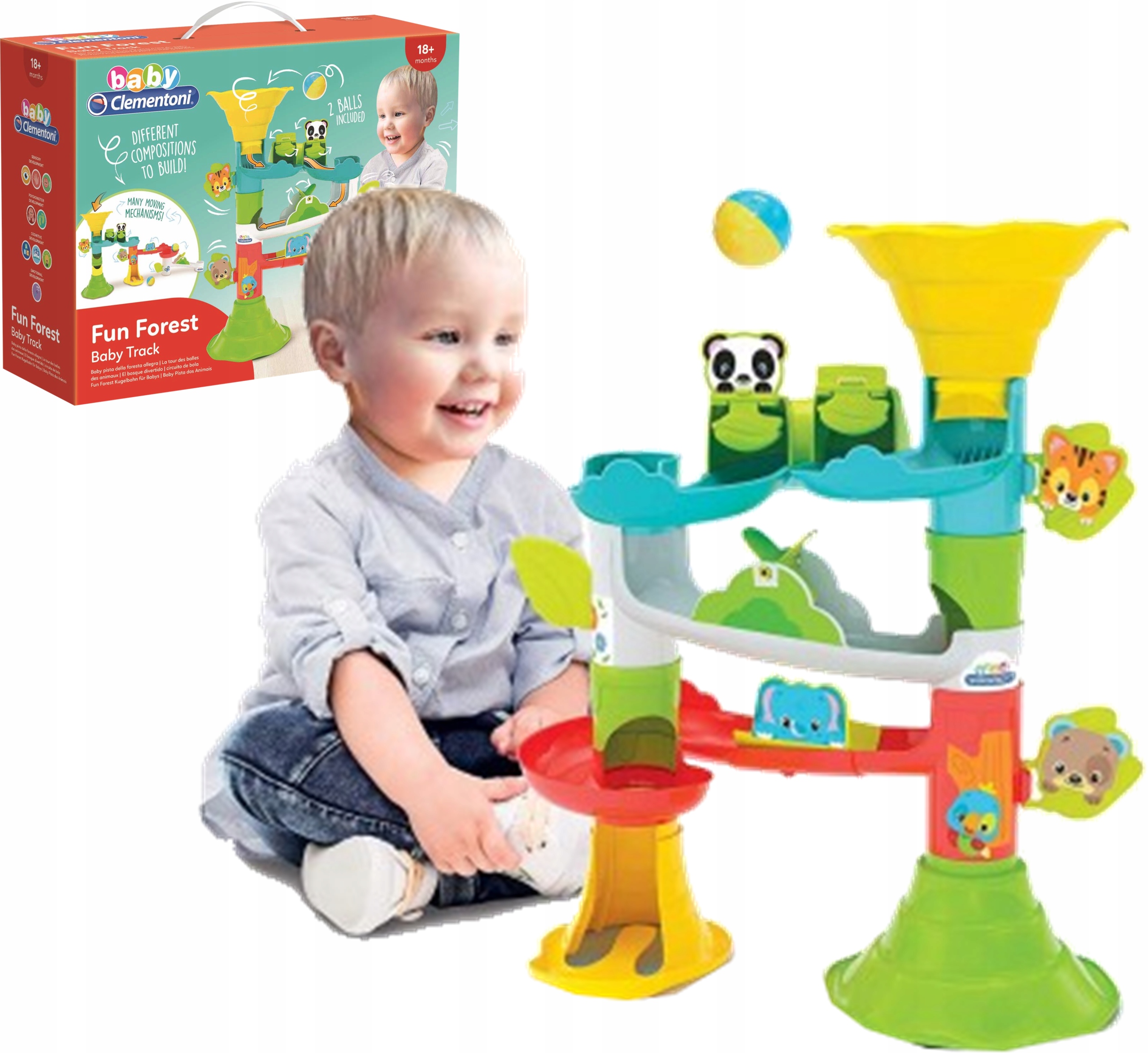 Zabawna gra na trasie z piłkami dla maluszków, którą można złożyć, rozmontować i zrekonstruować, aby utworzyć wiele różnych poziomych i pionowych torów.