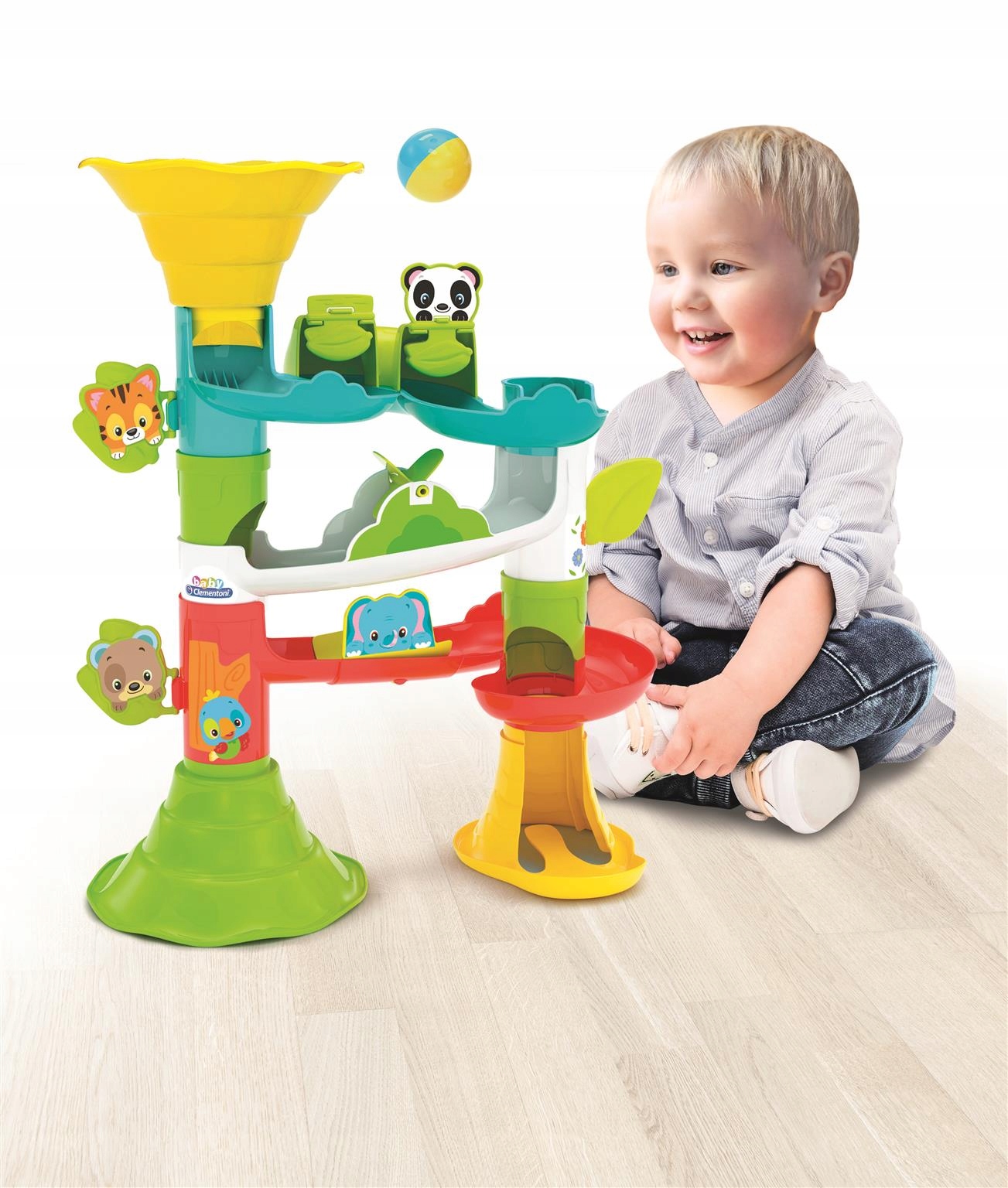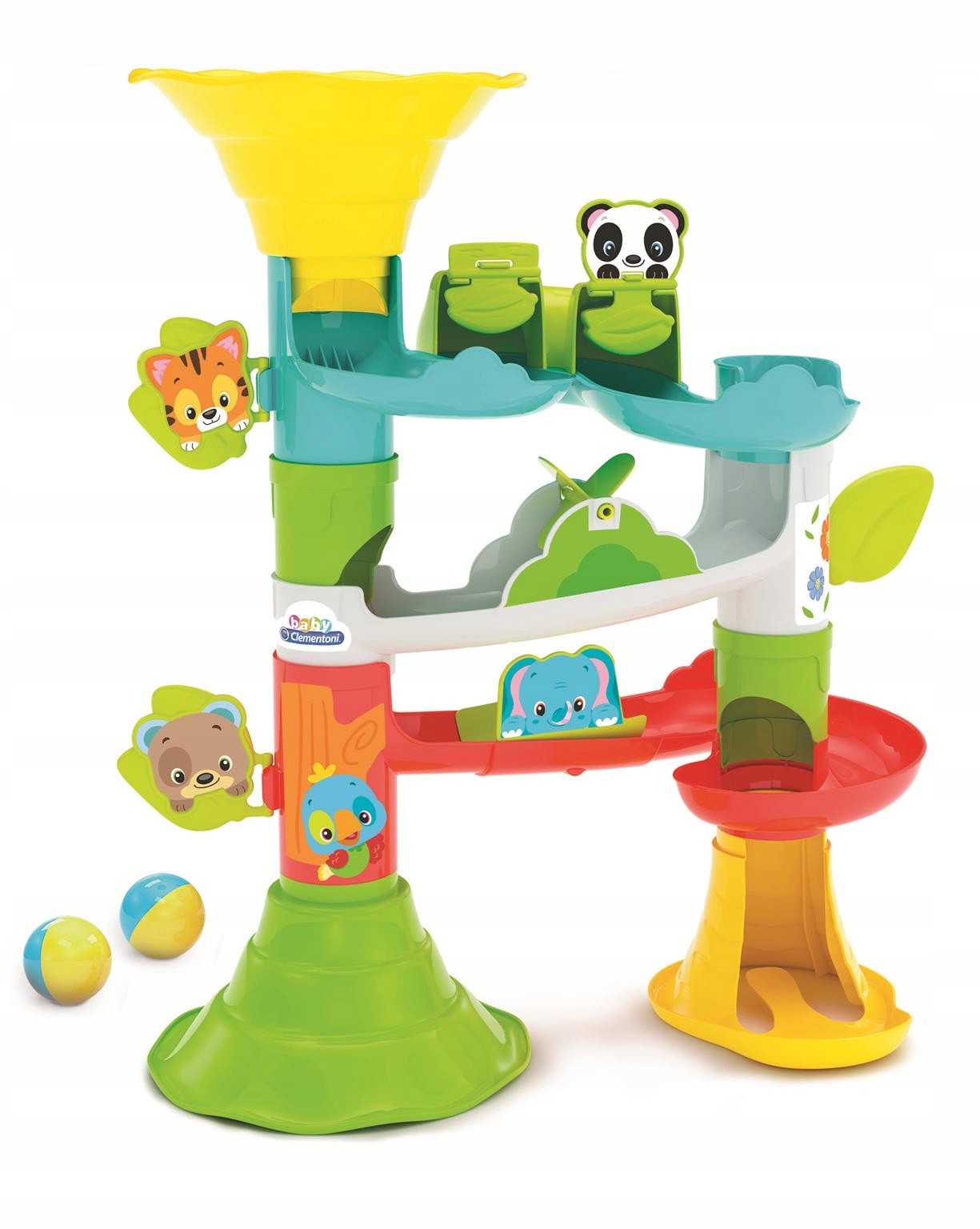 Tocząca się po torze piłka mija zwierzątka np.: Kotek, Panda, Misio, Słonik, Ptaszek i uruchamia zabawne zwierzęta w ruch.