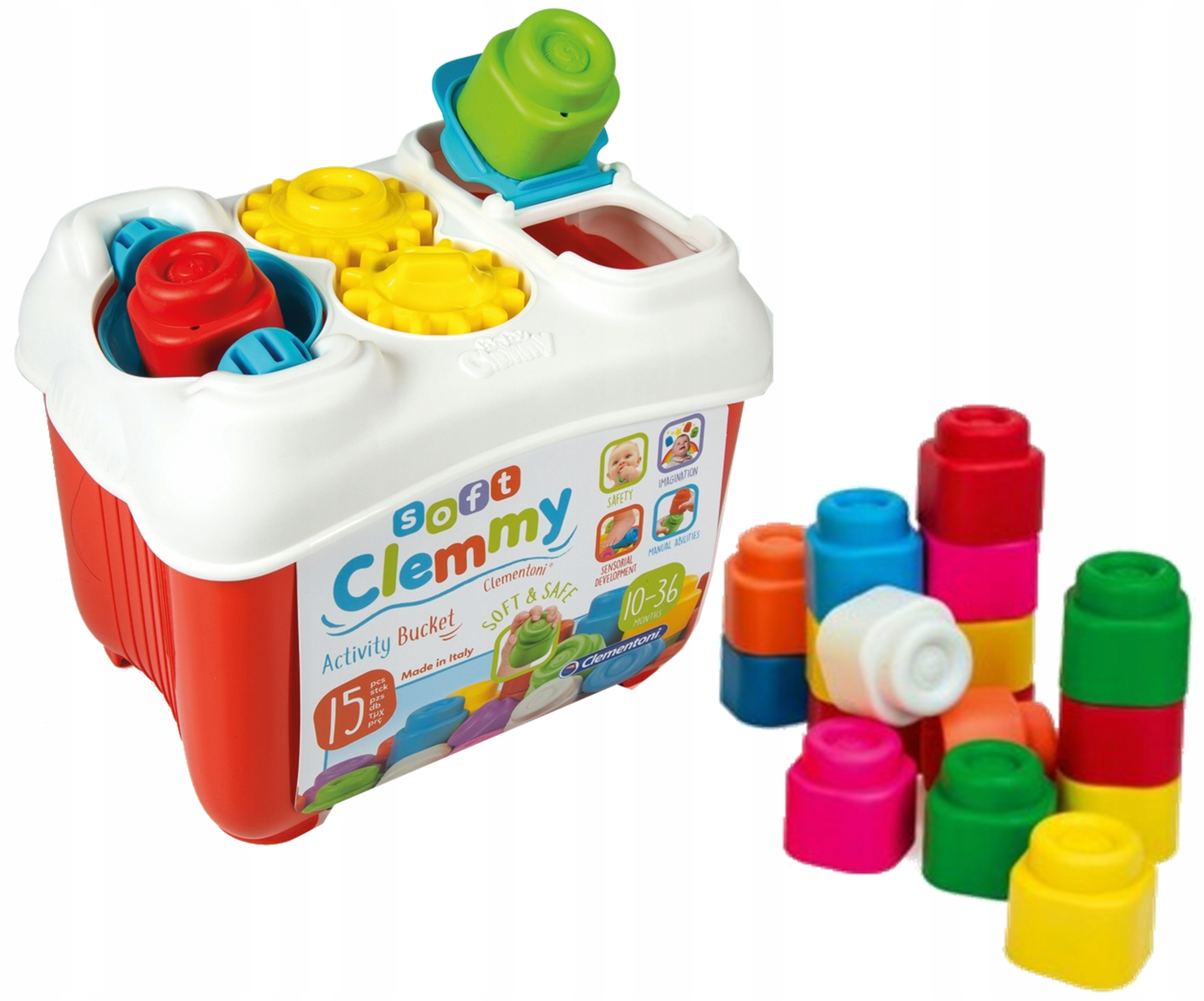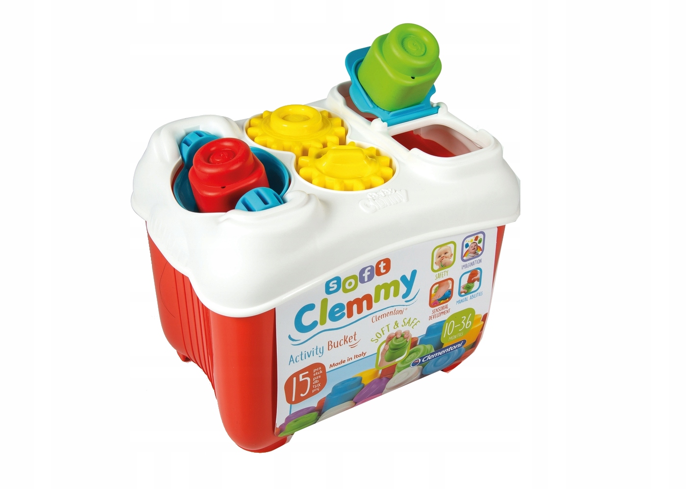Kolorowe wiadro z 15 klockami Clemmy i zabawną osłoną z mnóstwem ćwiczeń mechanicznych zaprojektowanych dla najmłodszych!